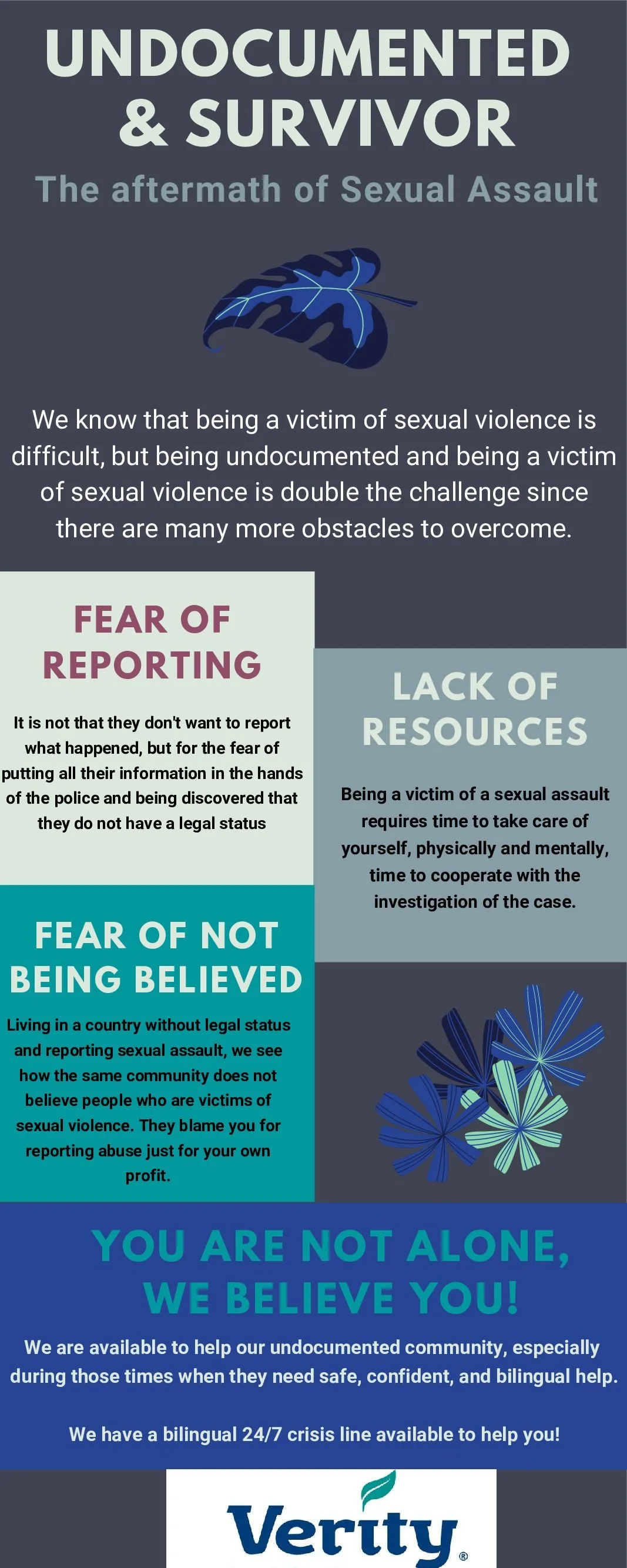 Verity is available to help our undocumented community, especially during those times when they need safe, confident, and bilingual help. If you or someone you know has been a victim of sexual violence and need help / guidance on how to proceed, feel free to contact us. We have a bilingual 24/7 crisis line available to help you! You are not alone, we believe you and we are here to help you.